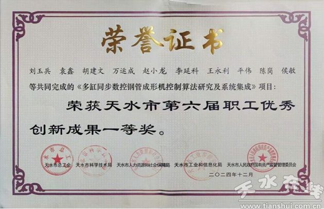 集团公司职工手艺立异《多缸同步数控钢管成形机节制算法研究及系统集成》获第十八届职工优良手艺立异一等;